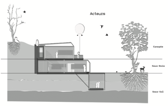 Nous avons choisi Fontainebleau, un des plus grands domaines de France, pour implanter le premier édifice d’un pro- jet destiné à la série. Divisé en trois étages, le bâtiment permet de mettre en relation les métiers analysant les sous-sols, les sous-bois et la canopée.