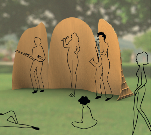 Les concerts en plein air sont la hantise de tout musicien : une mauvaise acoustique, une déperdition du son et un public qui ne sait pas où se positionner. Nous avons voulu recréer un espace pour accueillir les concerts en extérieur et proposer une meilleure acoustique.